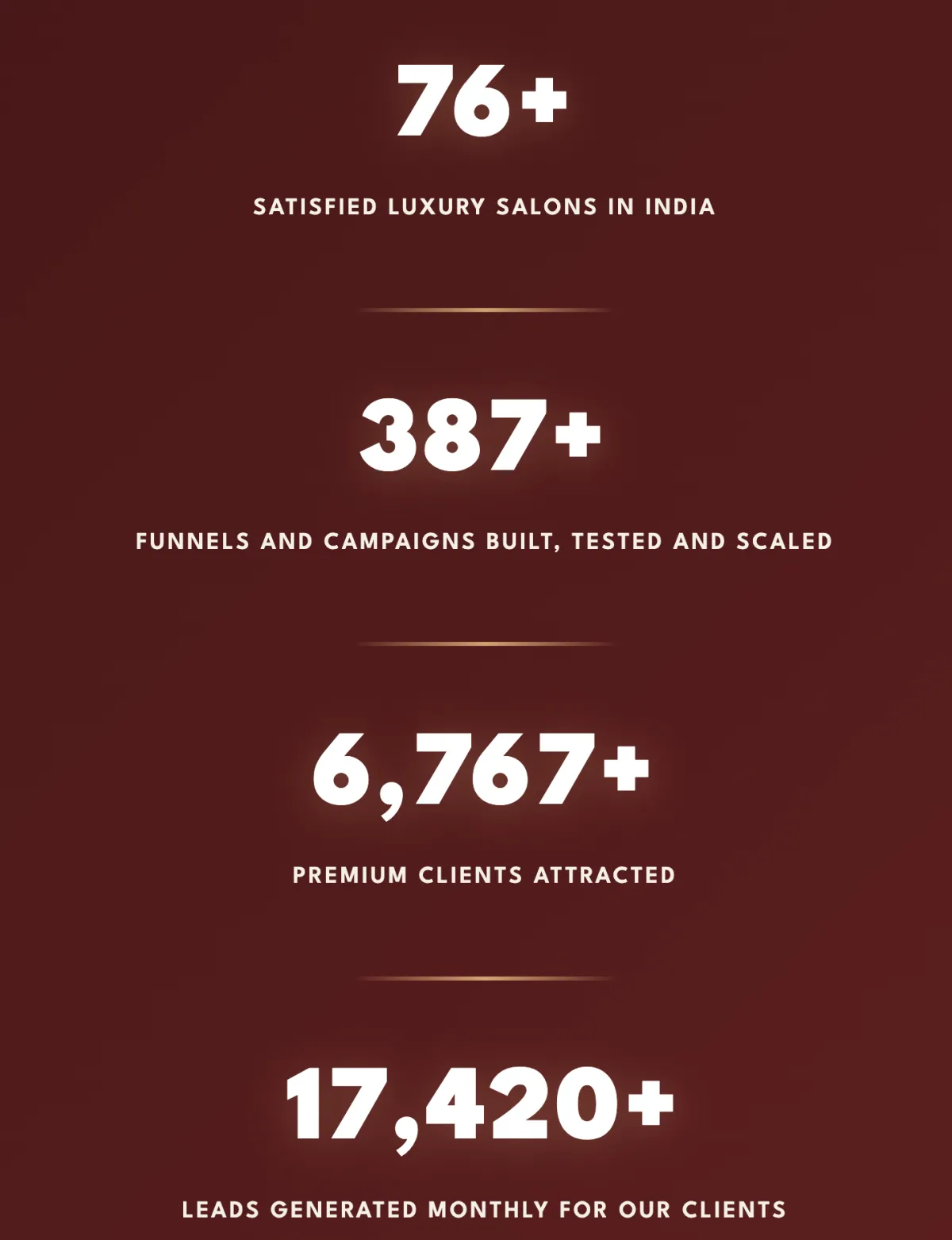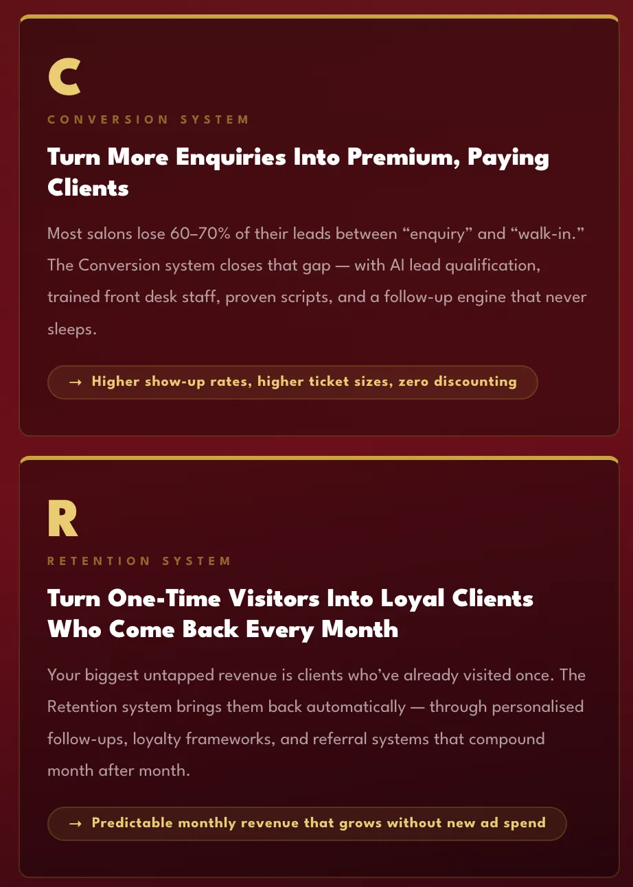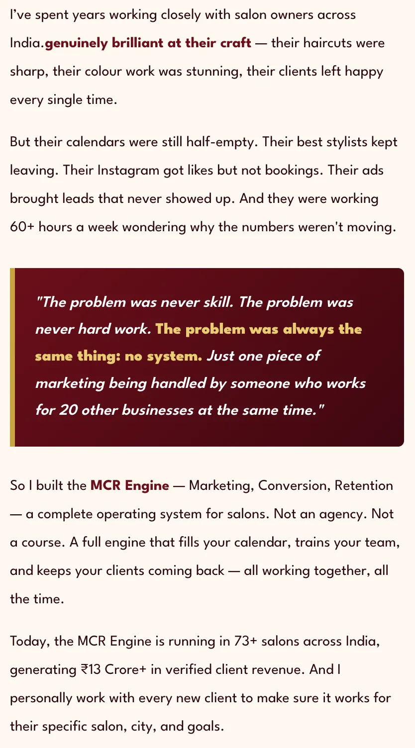 Most agencies sell you "Instagram reels" or "Google Ads" without understanding your business. We've built the MCR Engine (Marketing · Conversion · Retention) specifically for the Indian salon industry after working with 76+ luxury salons. We know what works, what doesn't, and how to scale predictably. This isn't generic digital marketing — it's a proven system.